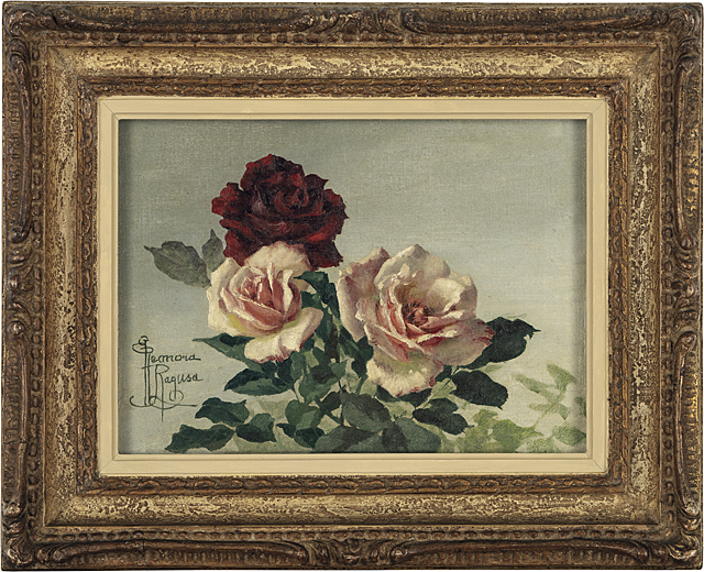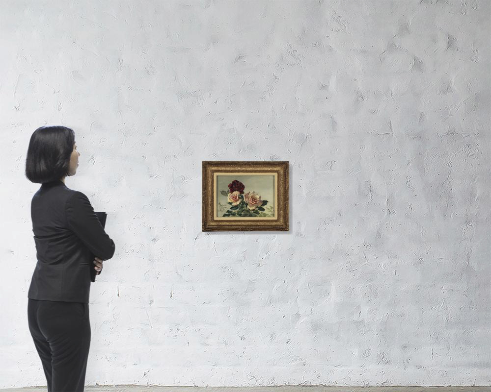 キャンバスに油彩 仏F3号 サイン有 画面所々に修復、数ヶ所に浅いヒビ 額付