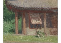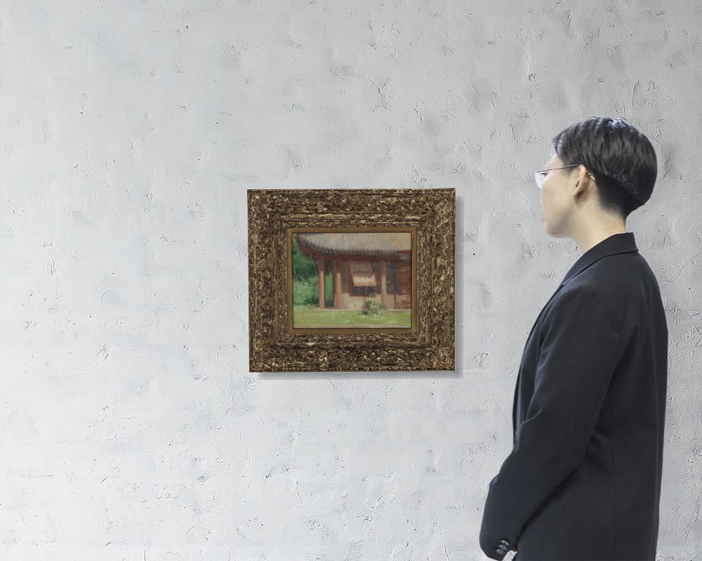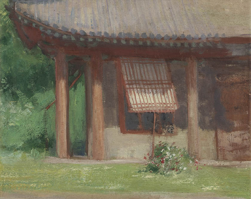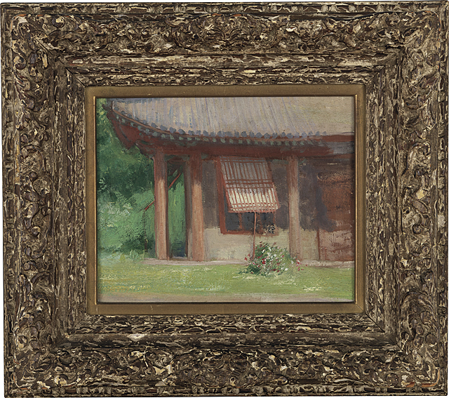 キャンバスに油彩 22×27.1cm(F3号) 板による裏打ち 板裏に「中村研一」の書付 画面数ヶ所に小さなシミ、ヒビ 額付