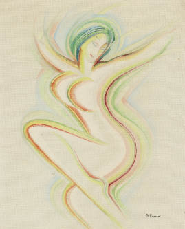パネルに貼付した布に水彩 53.3×43cm(変形10号) サイン有 画面全体に薄いヤケ、数ヶ所にシミ 額付
