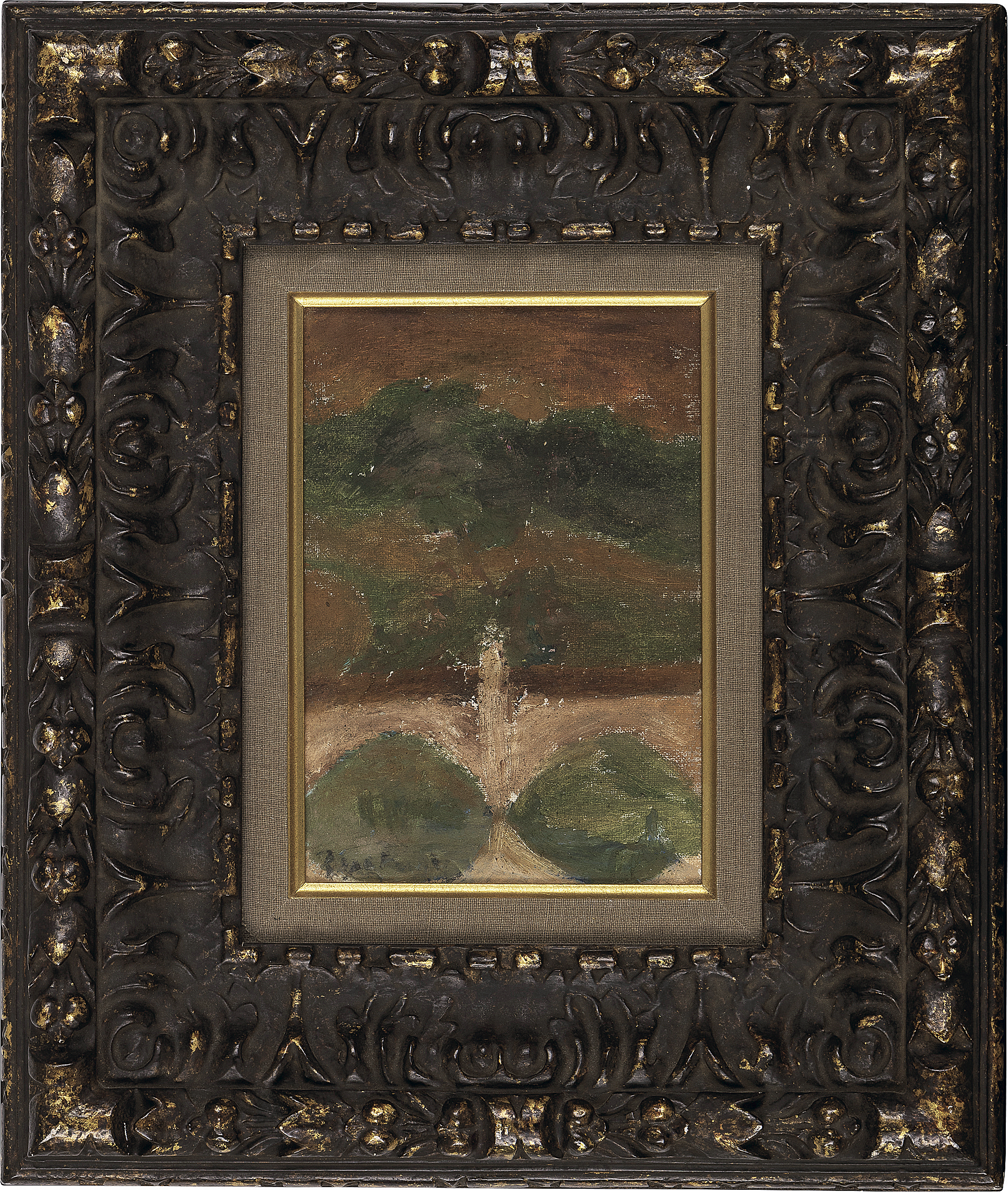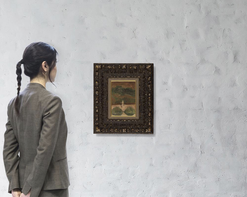 キャンバスに油彩 サムホール サイン有 キャンバス裏木枠にもサイン 画面数ヶ所にヒビ、絵具の浮き 額付