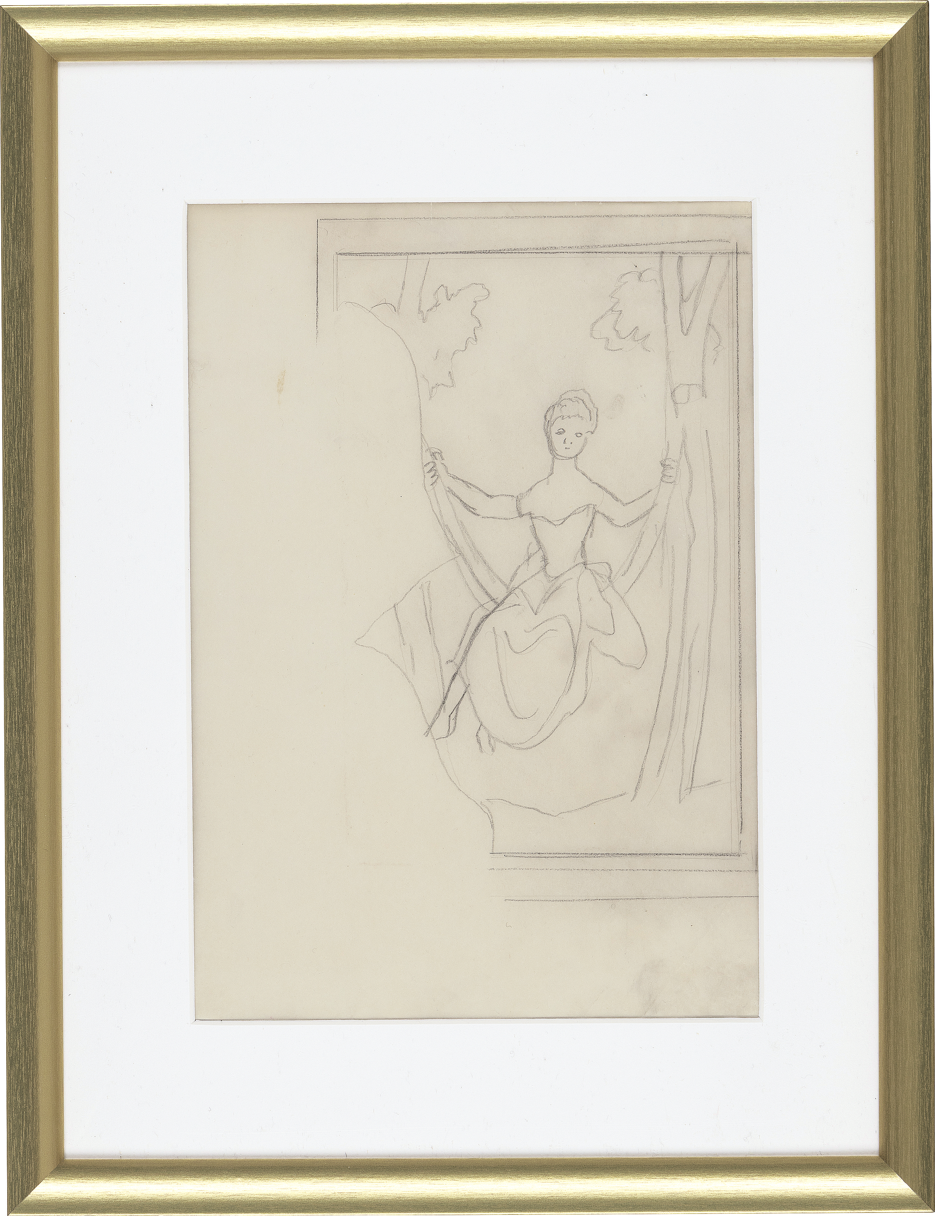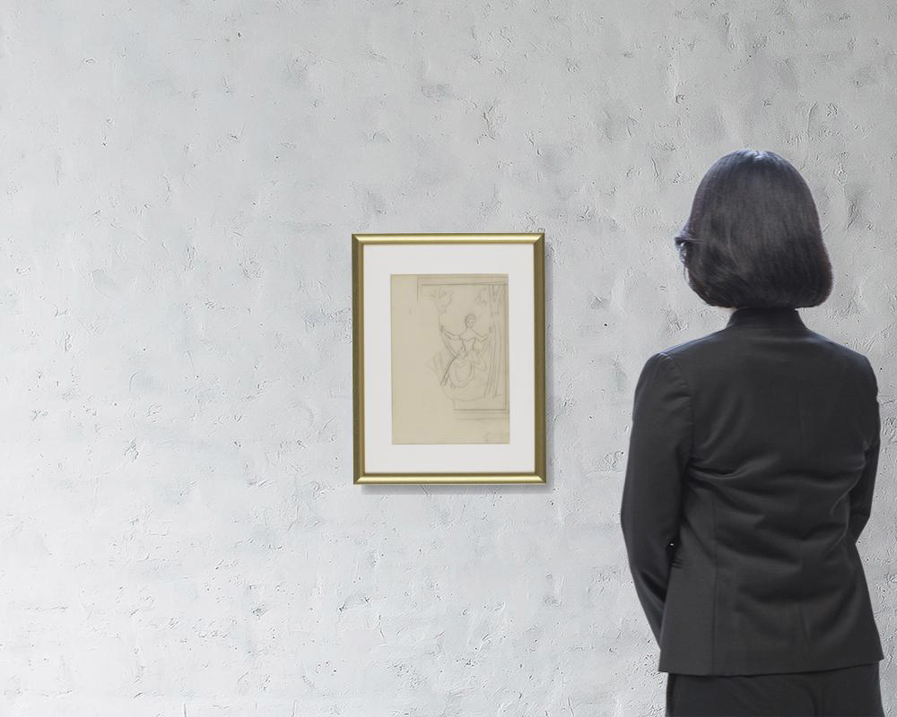 紙に鉛筆 32.2×25(紙)cm 「SUCCESSION KIMIYO FOUJITA」のエンボス印 画面全体にヤケ、数ヶ所にシミ、シワ、ヨゴレ、縁沿い2ヶ所にヤブレ、1ヶ所に紙の欠損 額付