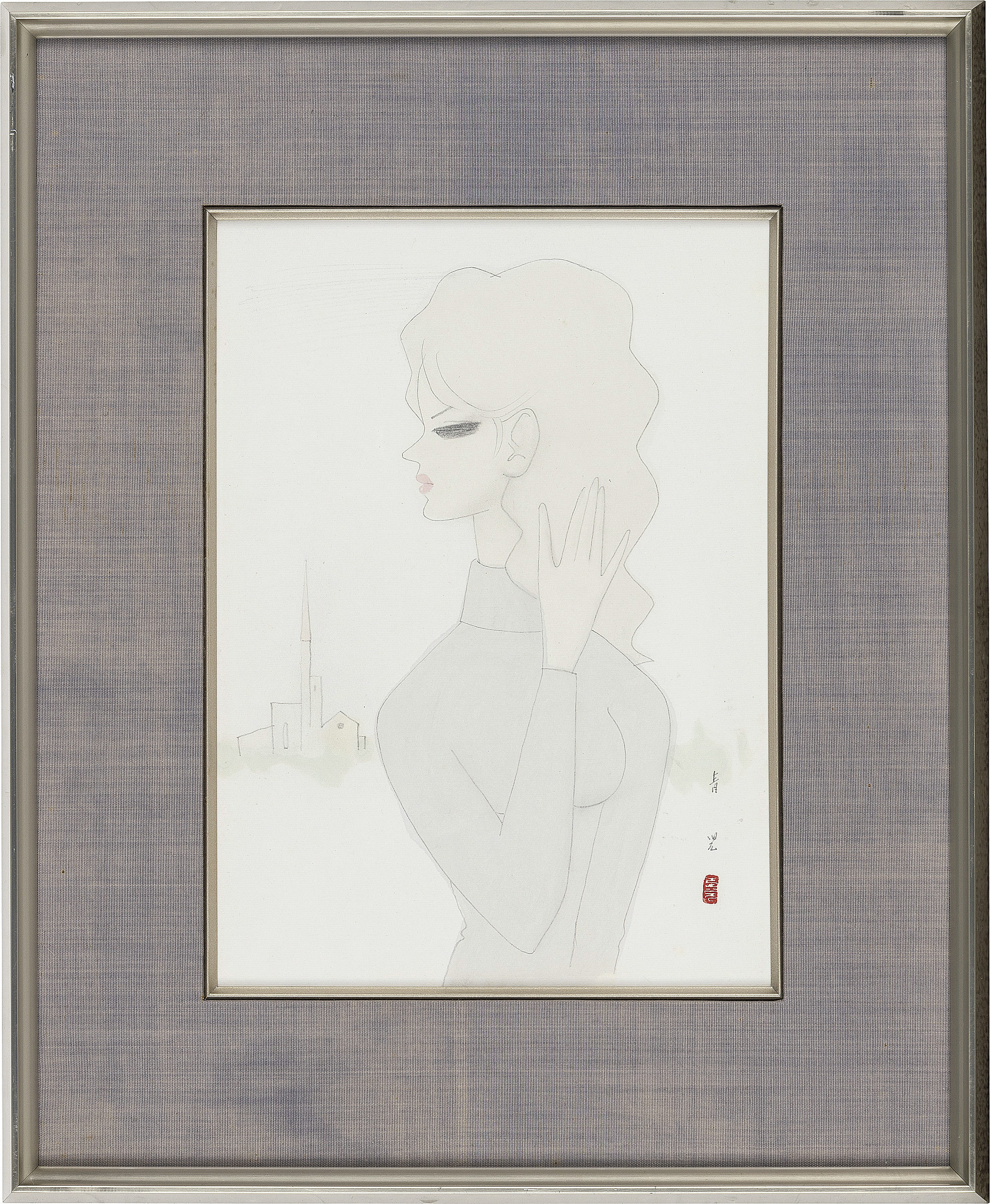 色紙に水彩 33×24(色紙)cm サインと印有 色紙裏にもサイン、タイトル 画面全体に薄いヤケ、数ヶ所に薄いシミ 額付