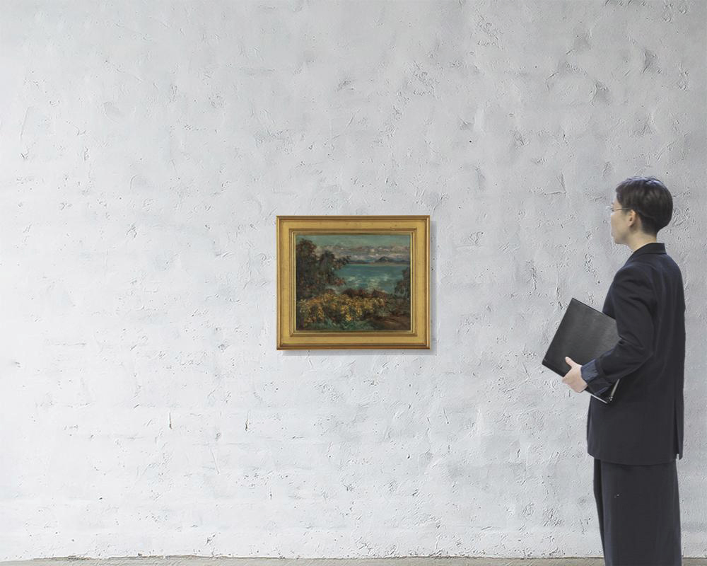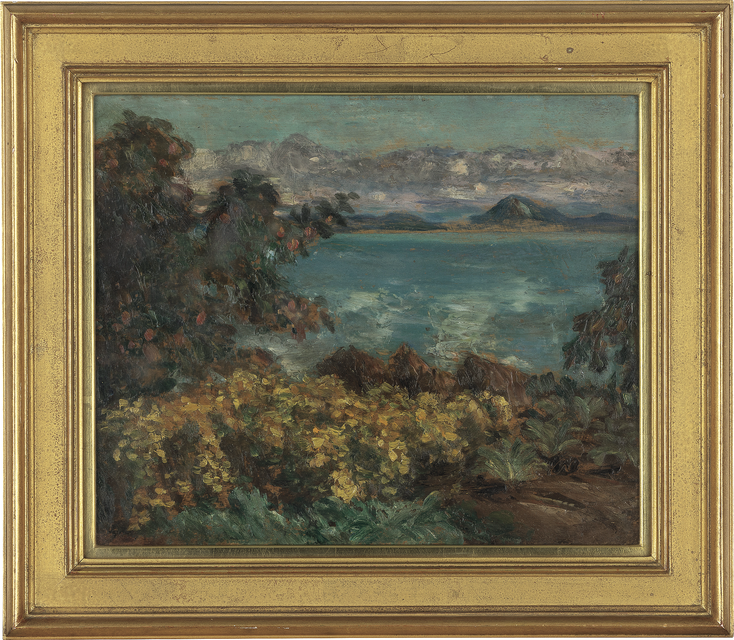 昭和4年(1929年) 板に油彩 37×46cm(変形仏8号) 板裏にサイン、タイトル、年記 画面全体にわずかな波打ち、数ヶ所にヒビ、わずかな絵具の縮み、縁沿い数ヶ所に剥落 額付*