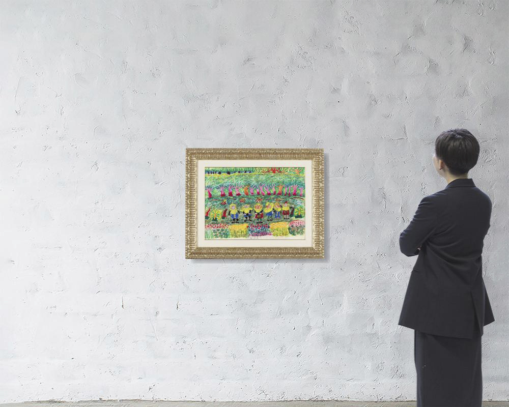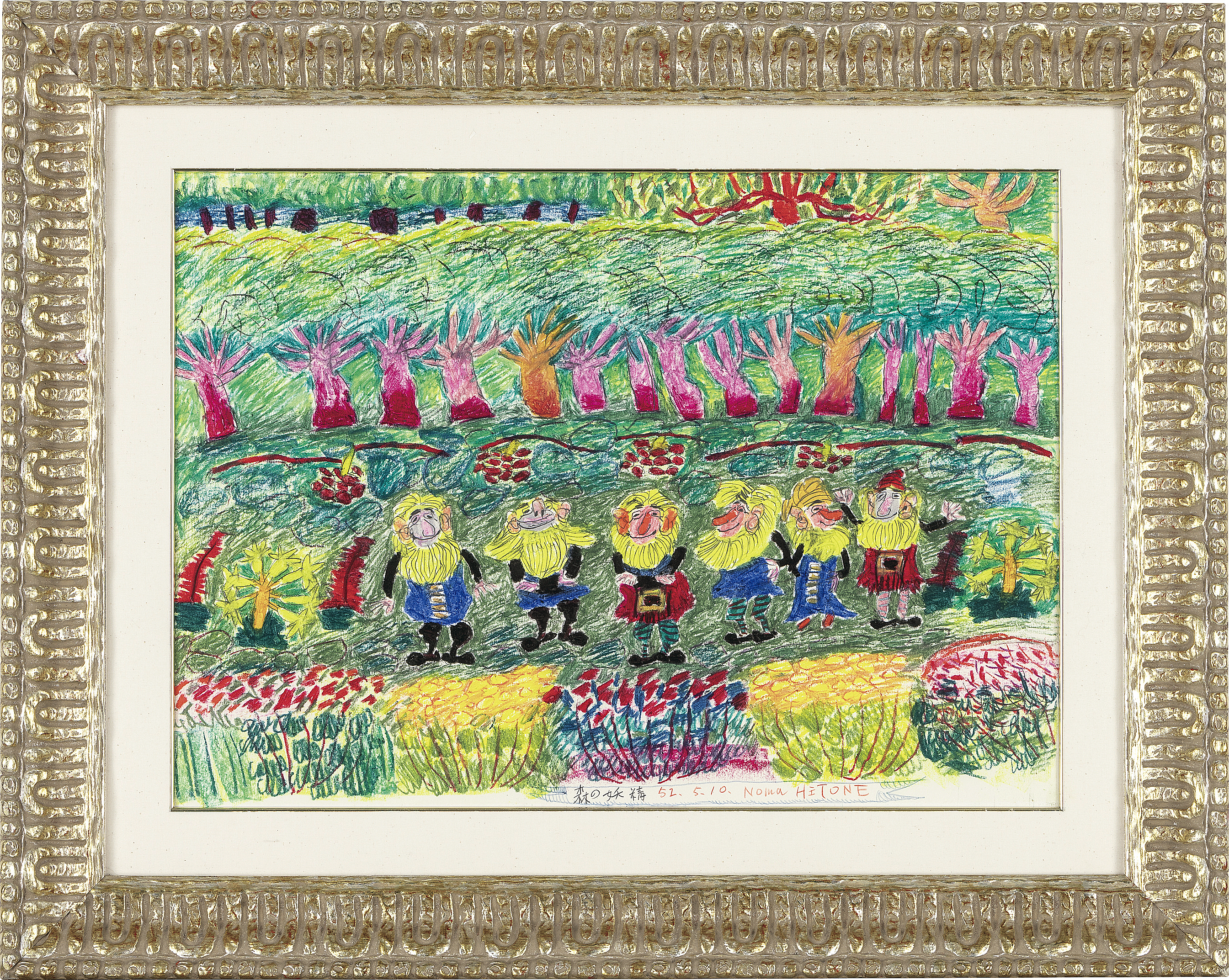 1977年 紙にオイルパステル 39.5×54.6(紙)cm サイン有 「日動画廊」シール 画面全体に薄いヤケ、縁沿い数ヶ所にピンホール 額付