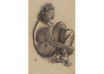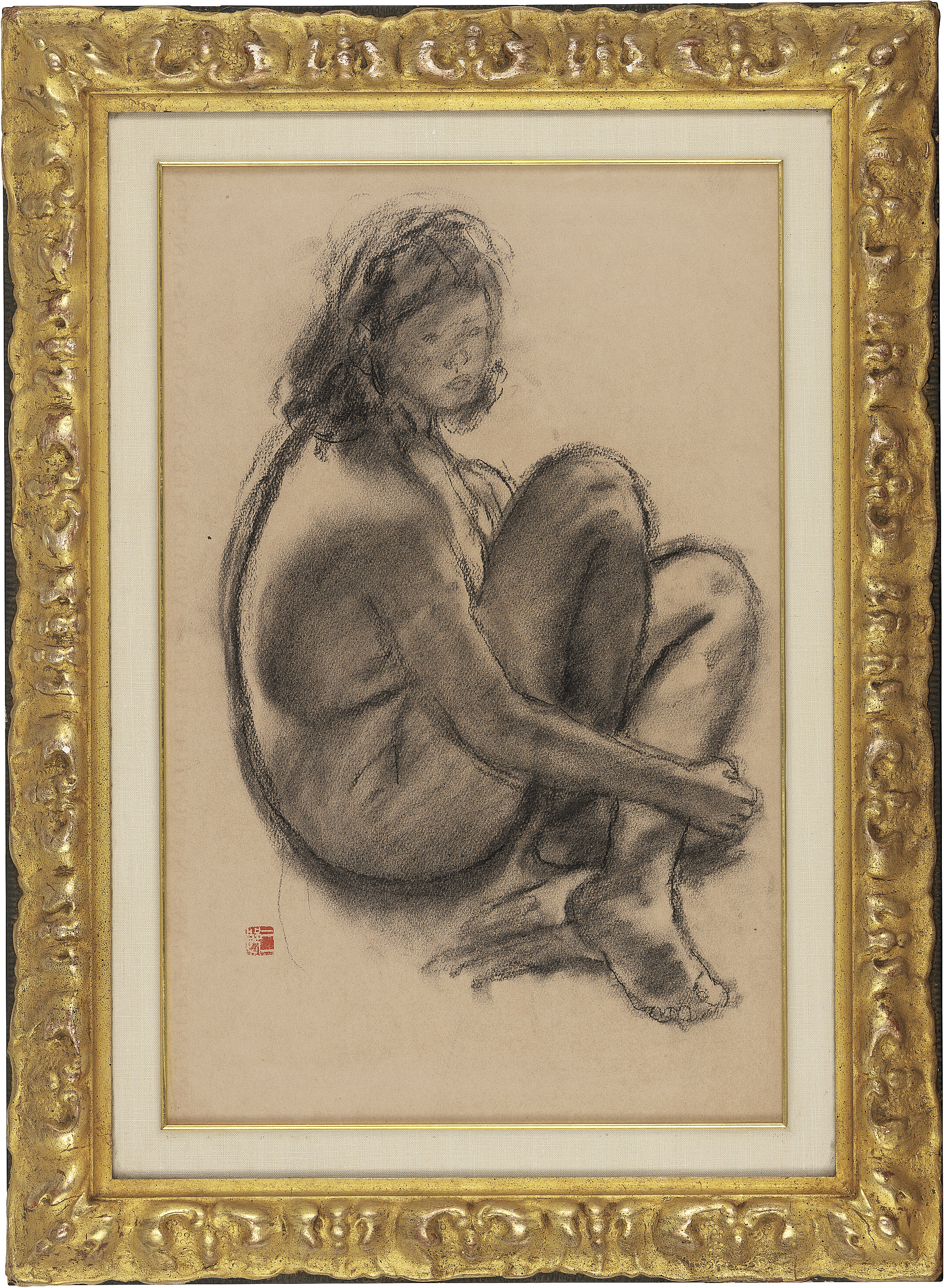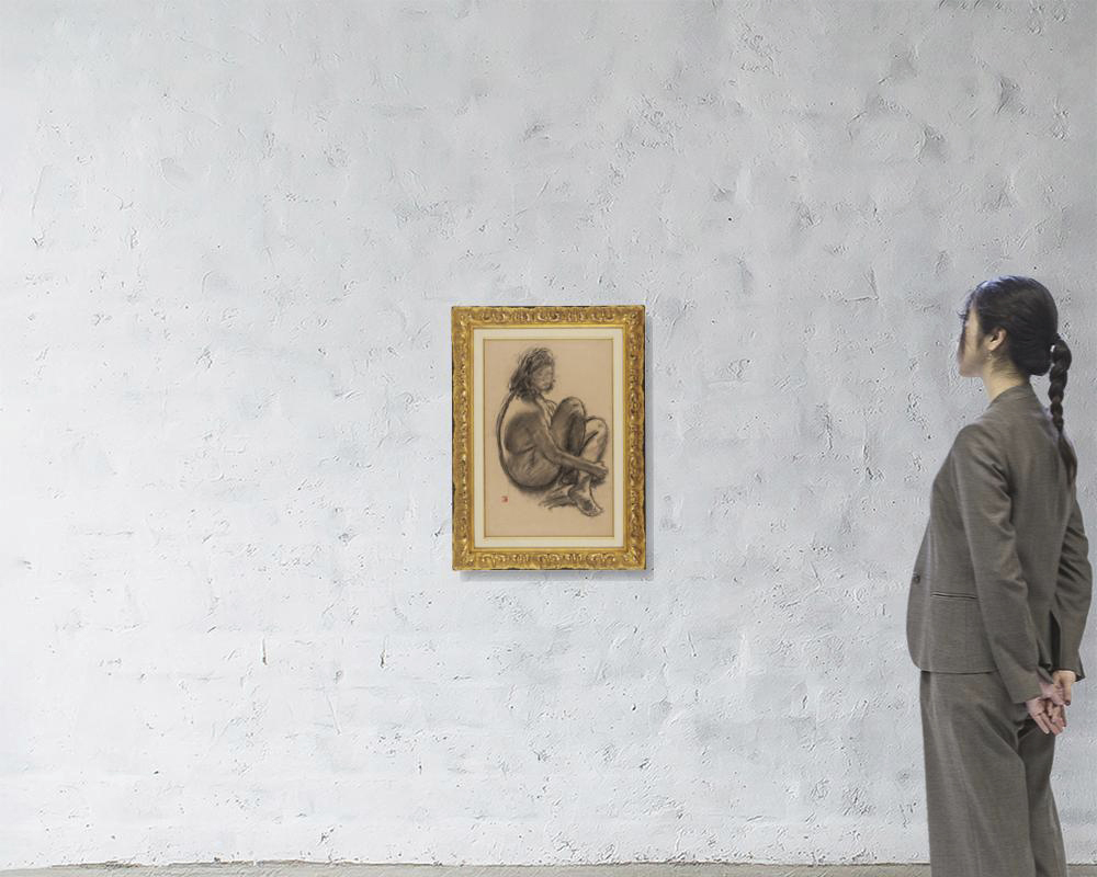 紙にコンテ 49.9×32.9(紙)cm 印有 画面全体にヤケ、数ヶ所に小さなシミ、縁沿い数ヶ所にシワ、1ヶ所にヤブレ 額付