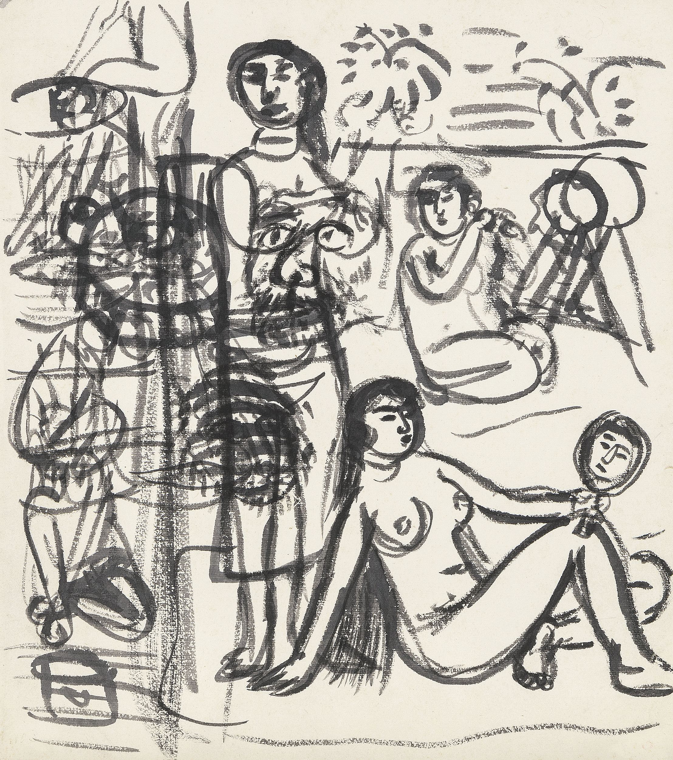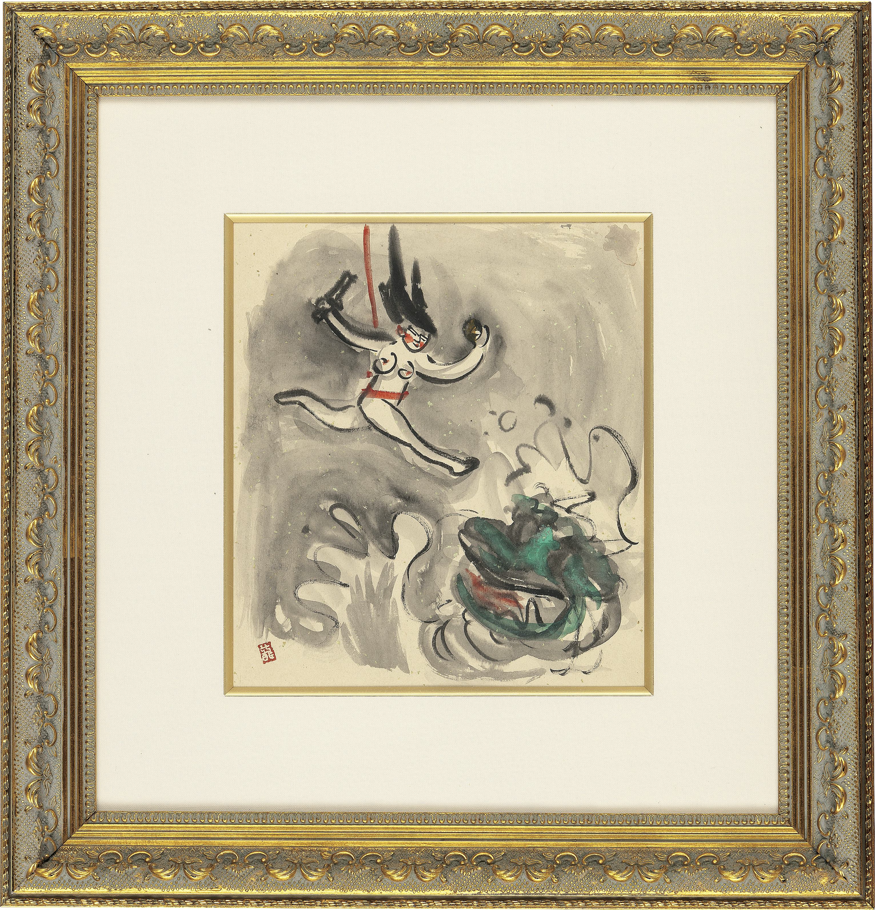 紙に墨・グワッシュ 27.3×24.2(紙)cm 印有 紙裏に墨によるドローイング 画面全体にヤケ、数ヶ所にシミ、シワ、縁沿い数ヶ所にわずかなヘコミ、四隅に小さな紙のメクレ 額付