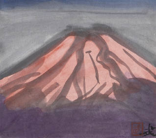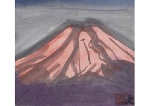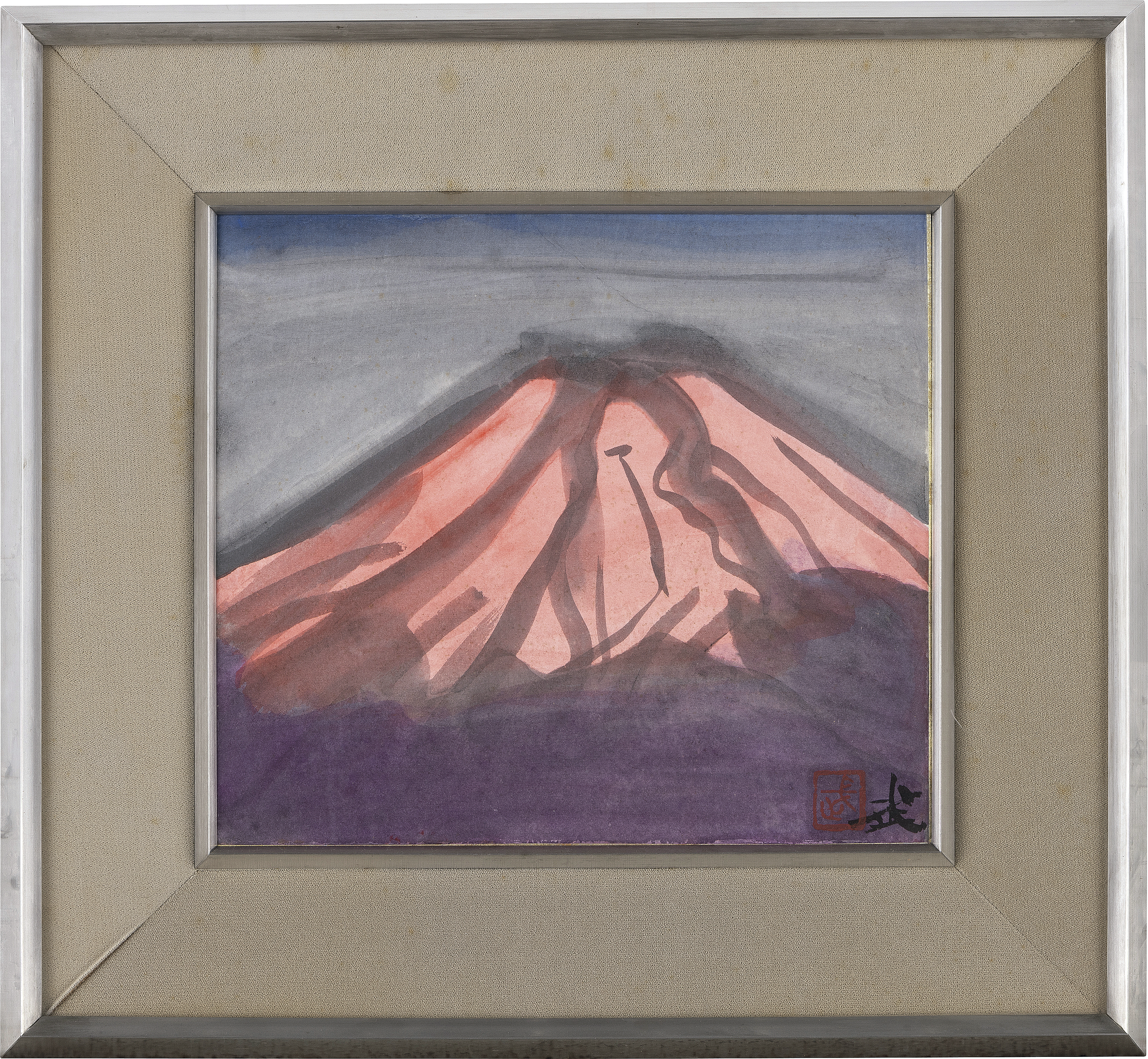 色紙に水彩 23.9×26.8(色紙)cm サインと印有 共シール 画面全体に薄いヤケ、数ヶ所にシミ、1ヶ所にシワ 額付