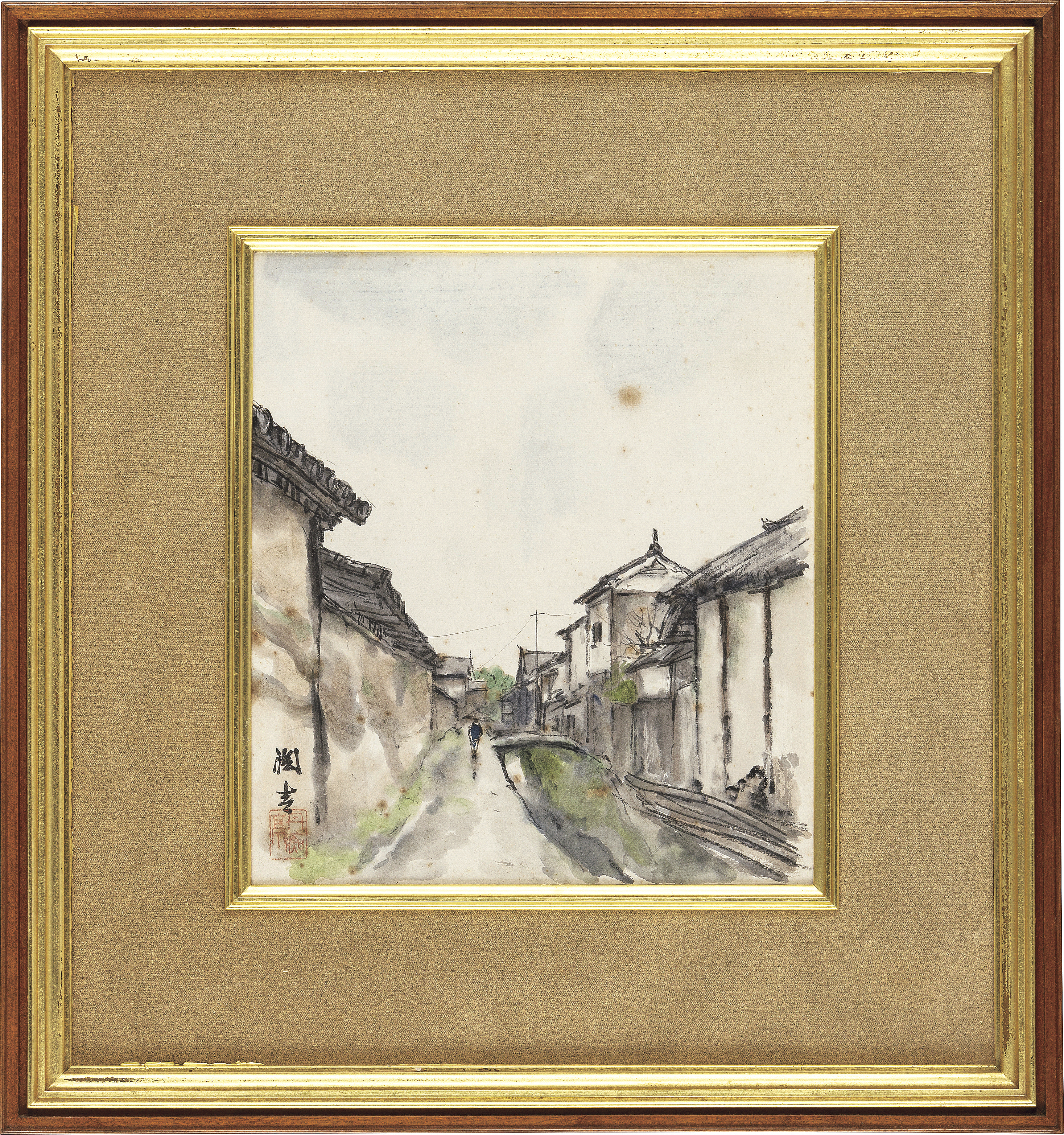 色紙に水彩 27×24(色紙)cm サインと印有 色紙裏にタイトル 共シール 画面全体に薄いヤケ、所々にシミ 額付