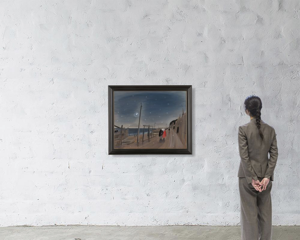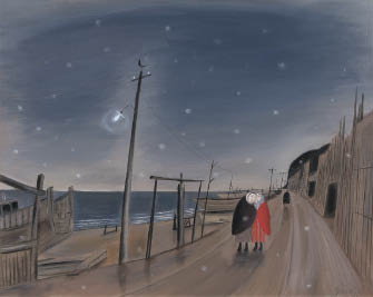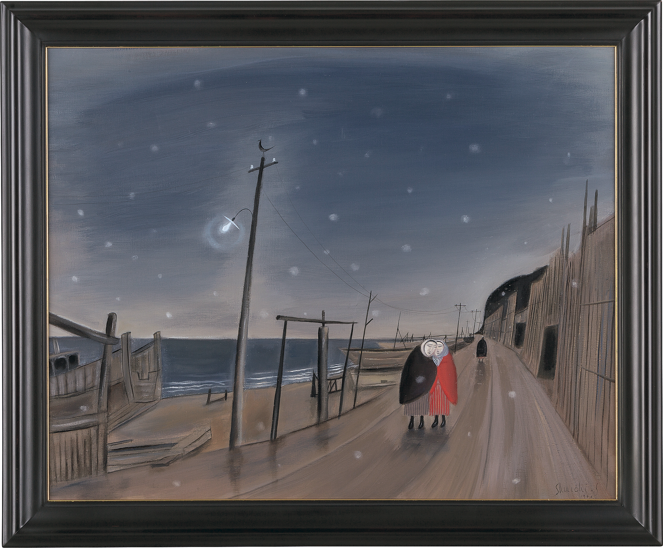 1985年 キャンバスに油彩 72.8×91cm(F30号) サイン有 キャンバス裏にもサイン、タイトル、年記 共シール(タイトル「雪が降る日 津軽裏歌シリーズ」) 画面数ヶ所にコスレ 額付