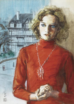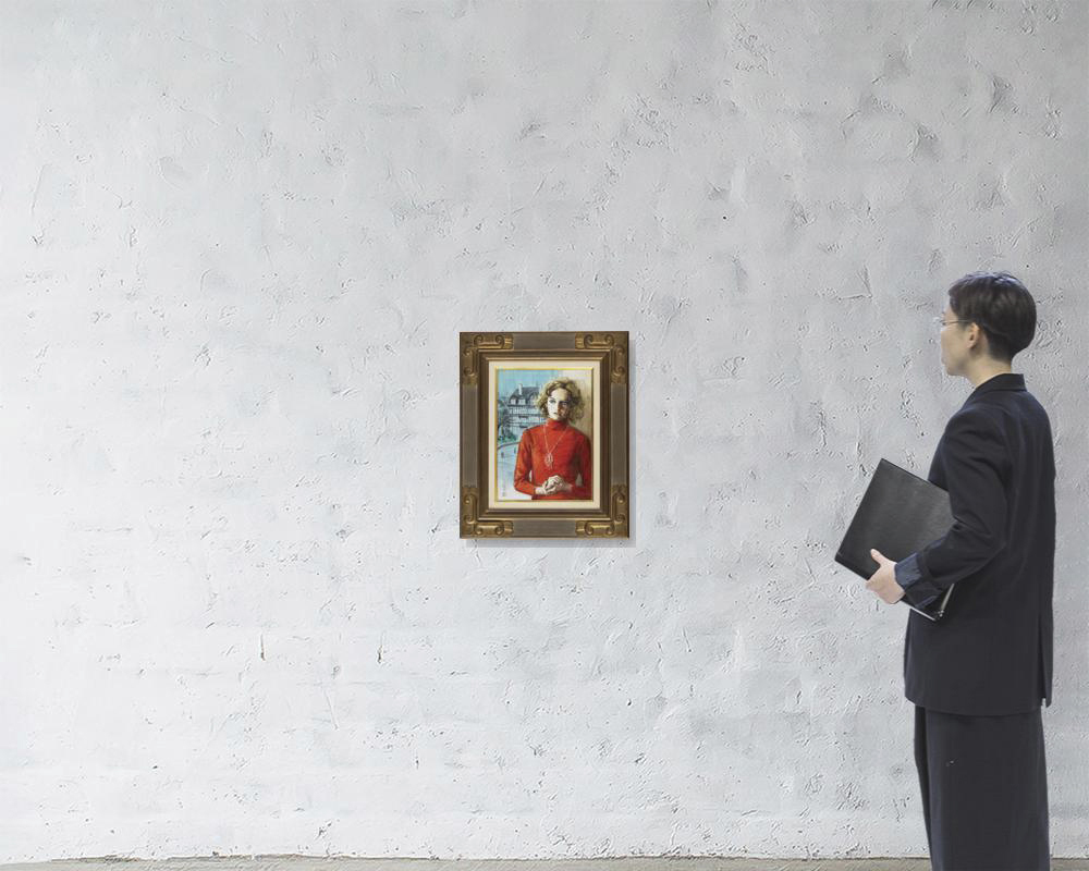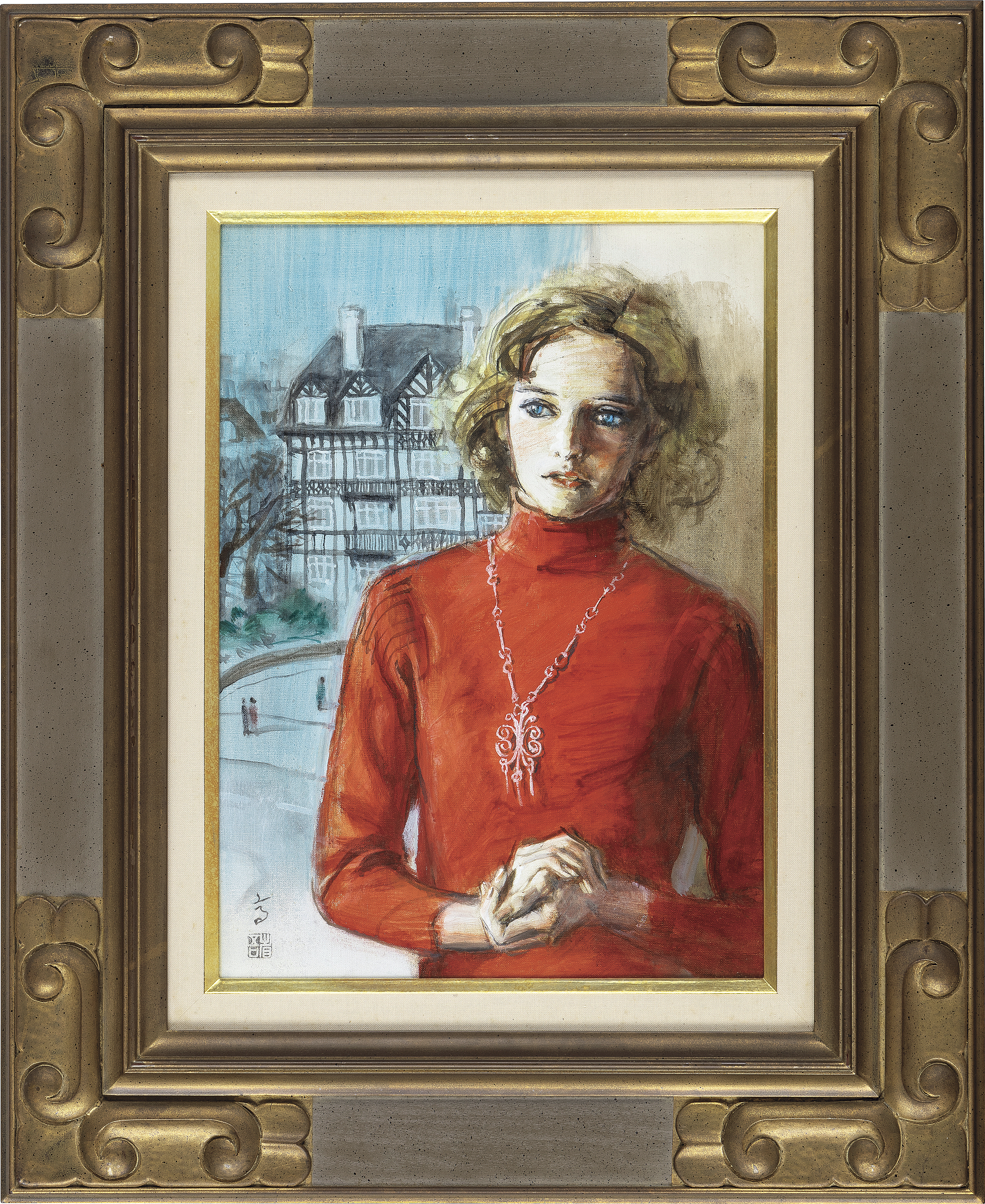 キャンバスに油彩 F4号 サインと印有 キャンバス裏木枠にもサイン、タイトル 共シール 画面数ヶ所に小さなシミ 額付
