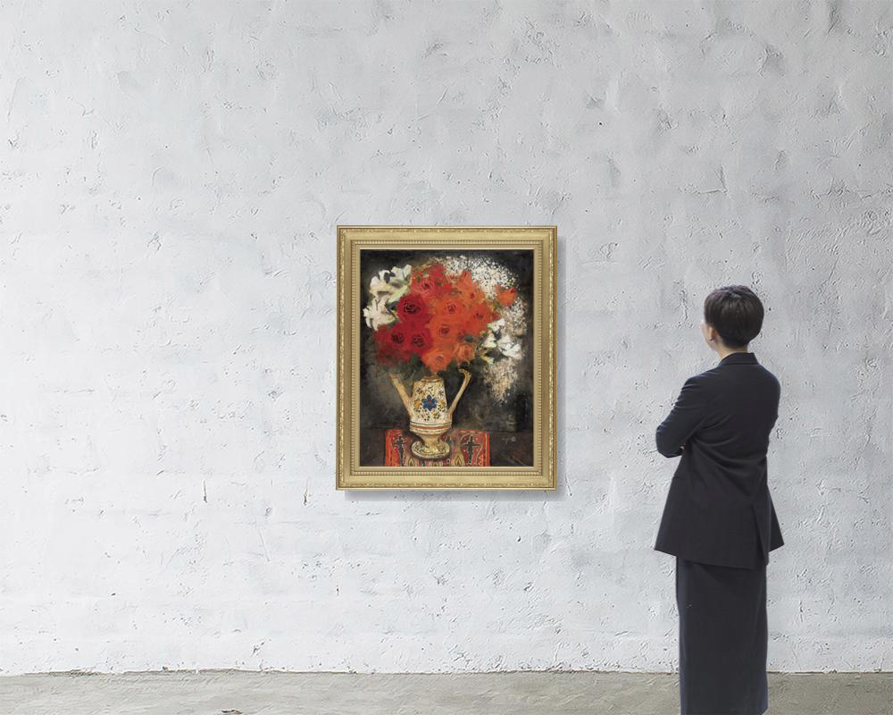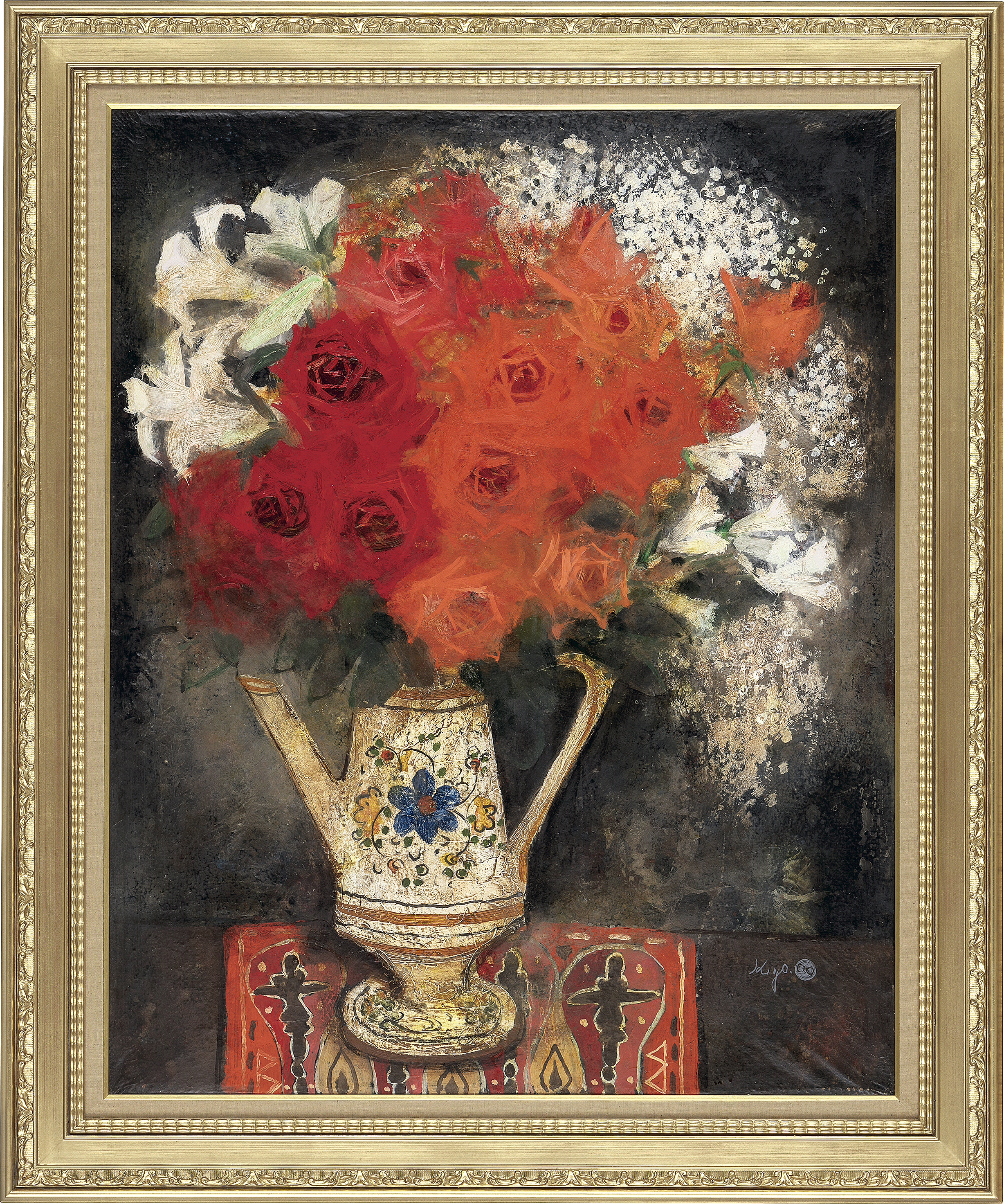 キャンバスに貼付した紙に油彩 F30号 サインと印有 キャンバス裏にもサイン、タイトル 画面数ヶ所に絵具の縮み、1ヶ所にヒビ 額付