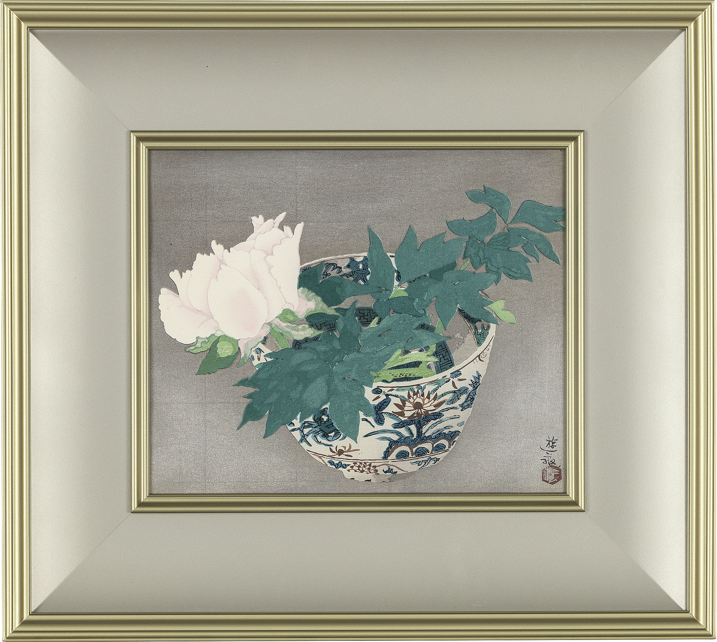アートジャパンNo.39 1992年 リトグラフ 49.8×40.3(額窓)cm 印有 ed.200 大体良好 他は【咲く】(アートジャパンNo.68 1996年 木版 23×28cm 落款と印共に版上 ed.200 ed.はマット下 シート全体に薄いヤケ、数ヶ所にシミ マージン数ヶ所にヤケ)【花菖蒲:「花三題」より】(アートジャパンNo.23 1988年 木版 18.2×41.5(扇面型)cm 落款と印共に版上 ed.300 ed.はマット下 版面全体に薄いヤケ マージン及び裏面にヤケ、数ヶ所にシミ)【椿】(アートジャパンNo.126 2010年 シルクスクリーン 18.2×27.3cm 印有 ed.200 ed.はマット下 シート全体に薄いヤケ 裏面縁沿い数ヶ所にテープ貼付) 全て額付*