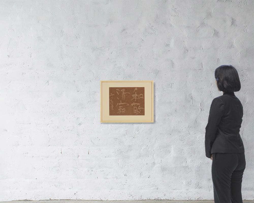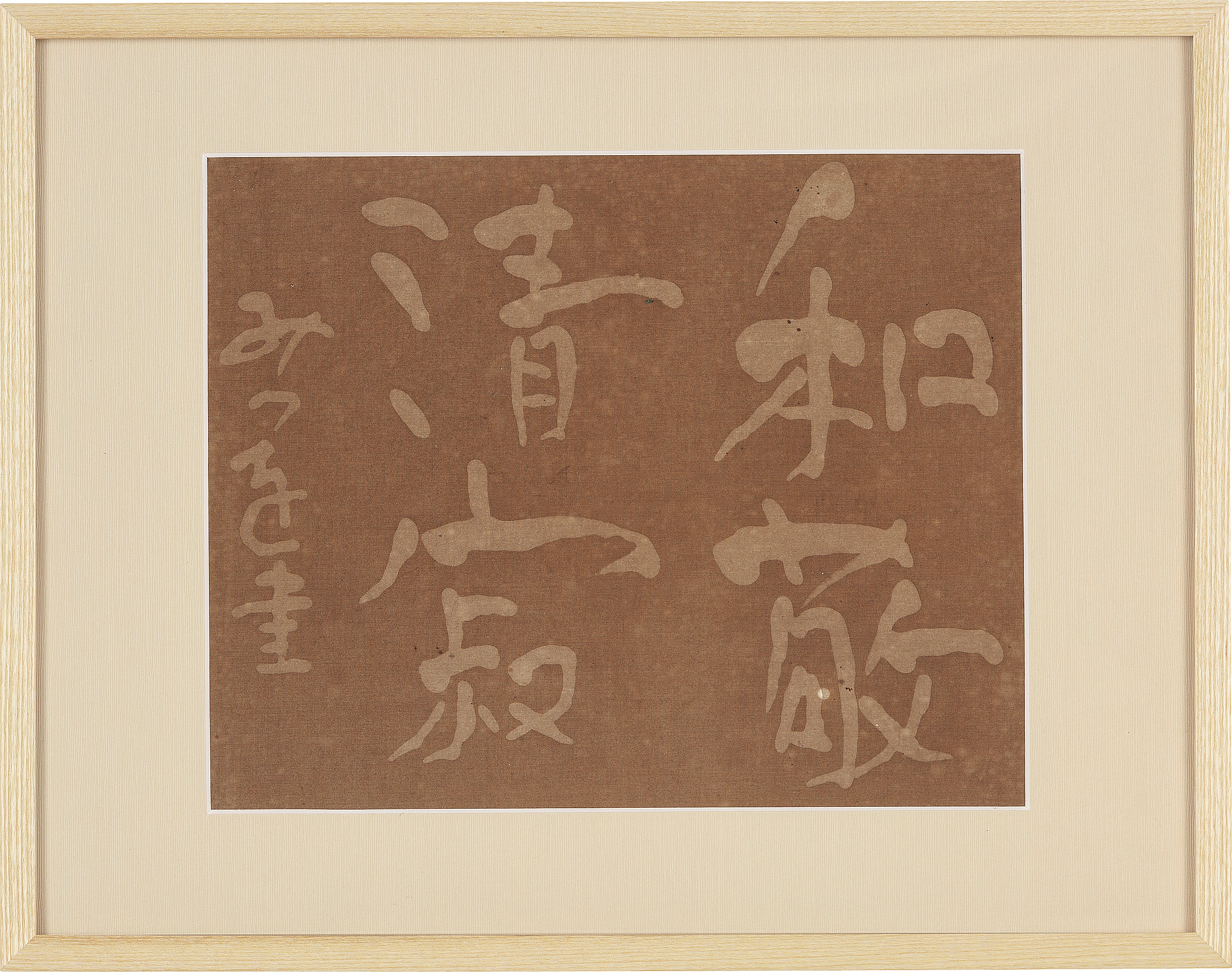 布に蝋纈染 32.3×39cm 版上サイン 紙による裏打ち 版面全体にヤケ、所々にシミ 額付