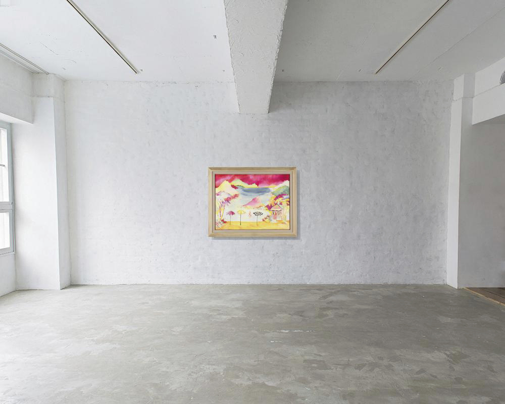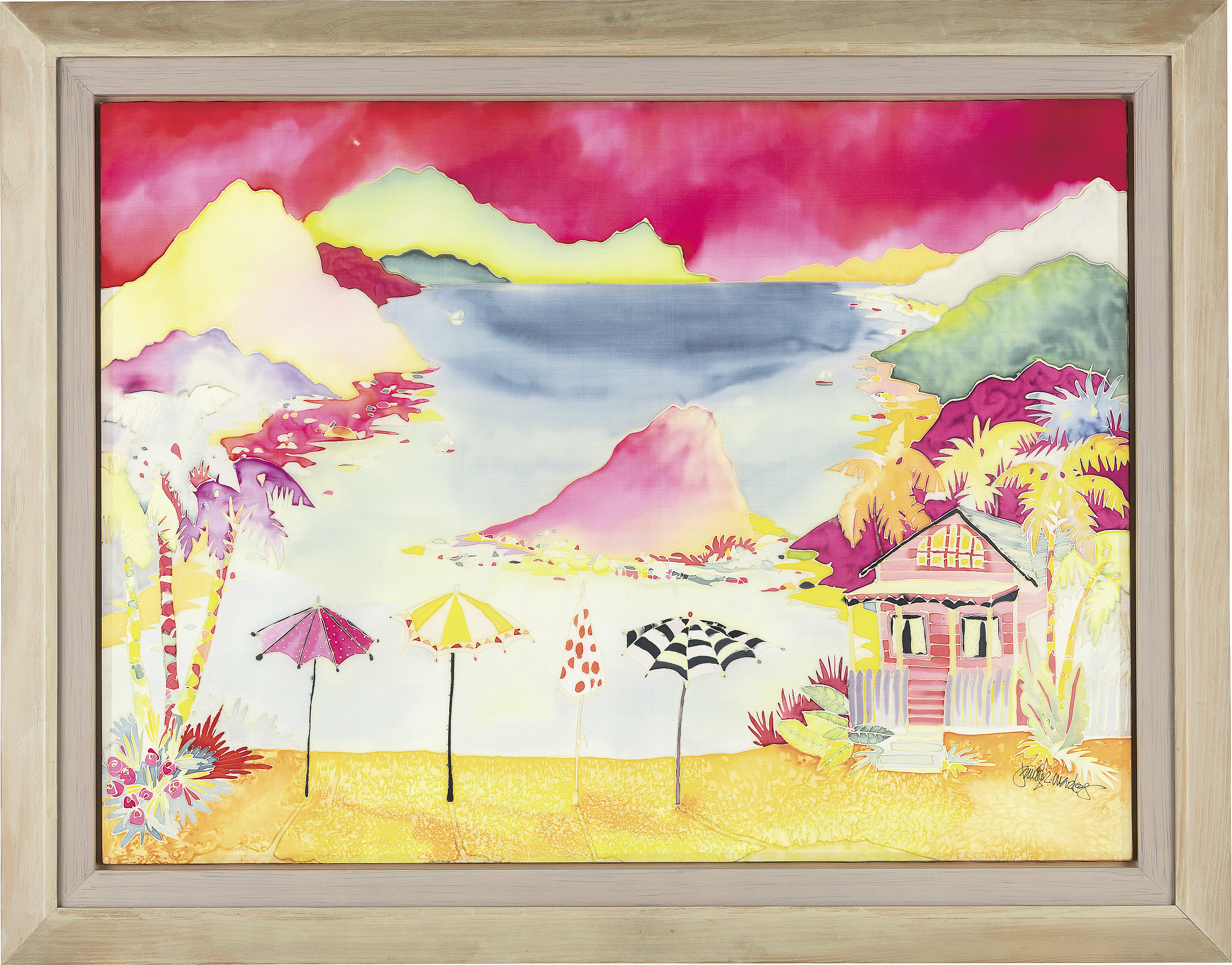 シルクペインティング 88.2×119cm サイン有 画面全体に薄いヤケ、数ヶ所にシミ 額付*